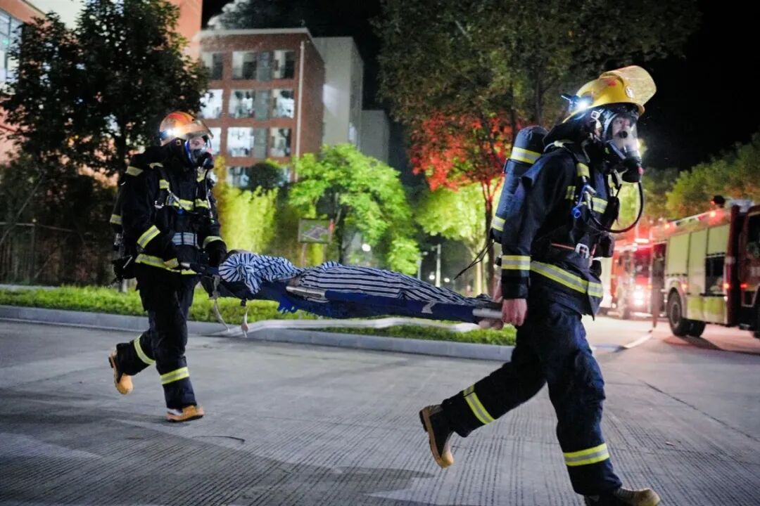 消防车鸣笛抵达校门后,校门值班保安驾驶电动车引路,巡逻保安同步快速清除校道路障,确保消防车一路畅通无阻,以最快速度直抵“火场”。消防员迅速进入“火场”,搜救出模拟“伤者”并转移至医疗救护帐篷。