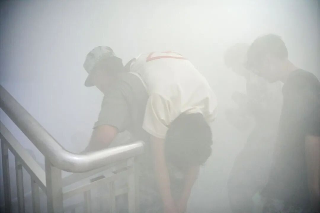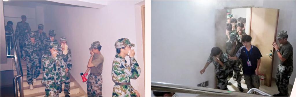 在辅导员、宿管员的沉着组织下,参演学生迅速用湿毛巾掩住口鼻,采取低姿势沿预定疏散路线快速撤离至安全区域。