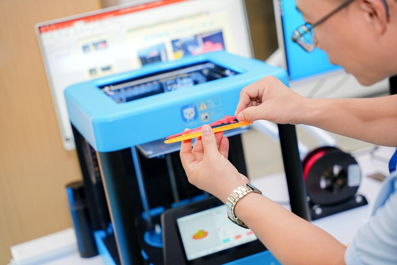 讲座结束后,参与者移步创科楼3楼中庭,开启一场“动手玩转科技”的实践之旅。在3D打印工作室内,一台台精密设备正“层层叠加”材料,将数字模型转化为实体物件。工作人员现场演示了3D打印在医疗、航空、教育领域的创新应用,并指导参与者设计并打印专属3D钥匙扣、创意摆件等小物件。一名大学生兴奋地表示:“没想到复杂的增材制造技术,竟能通过简单的操作实现!这让我对智能制造有了更直观的认识。”