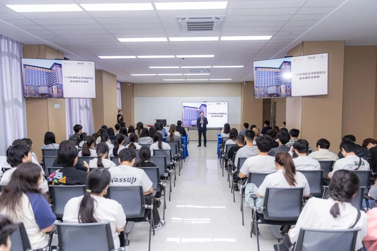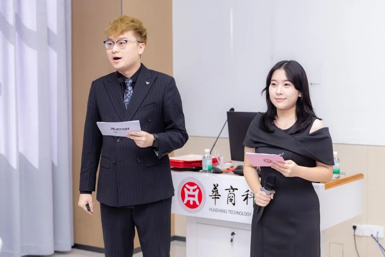 万豪国际集团大中华区奢华品牌校企关系项目负责人/广州W酒店人力资源总监冯屹先生,深圳星河丽思卡尔顿酒店、深圳瑞吉酒店、深圳前海华侨城瑞吉酒店、深圳前海华侨城JW万豪酒店、金茂深圳JW万豪酒店、深圳华发JW万豪酒店等单位人力资源负责人,以及十余位万豪集团大湾区奢华品牌各酒店人力资源部同仁莅临活动现场;广州华商职业学院副校长赵永锋、产科教融合办公室主任王克明、招生与就业办公室主任陈锦辉,酒店管理与厨艺学院院长林红梅、副院长谢锦权、各专业负责人、辅导员以及180余名学生代表参加活动。活动由广州W酒店学习与发展经理牟潇凡与我校酒店管理与厨艺学院同学庄舒乔主持。
