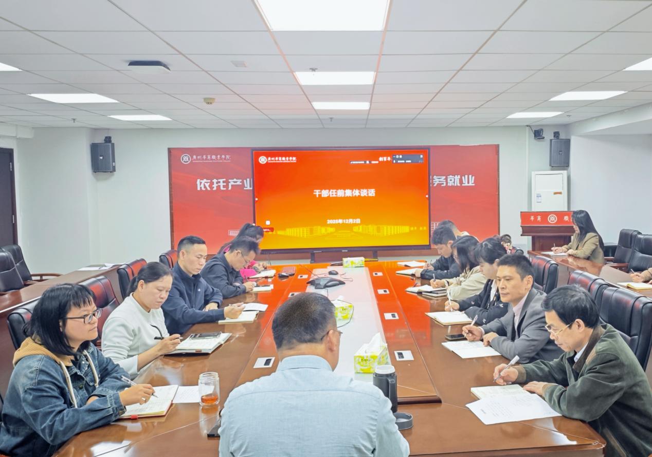 为加强干部队伍建设,强化履职担当意识,12月2日上午,广州华商职业学院在广州校区行政楼715会议室及江门校区7号楼201会议室(线上同步)召开新任职干部集体谈话会。学校党委书记翁礼成、党委组织部部长潘京萍、人事与质量部部长石朝阳出席会议,全体新任职干部参会。