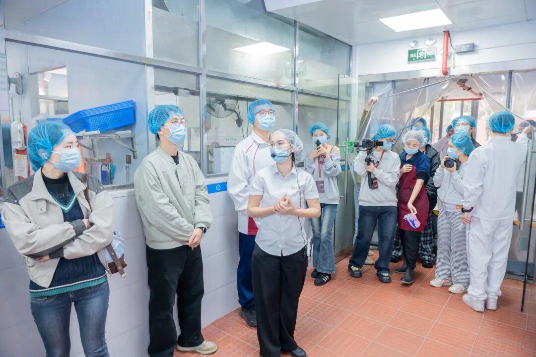 演练结束后,活动进入“明厨亮灶,食安共筑”后厨参观环节。师生代表们在第一饭堂经理庄妃晓的引导与讲解下,穿戴好一次性防护用品,有序走进第一饭堂的后厨操作区域。