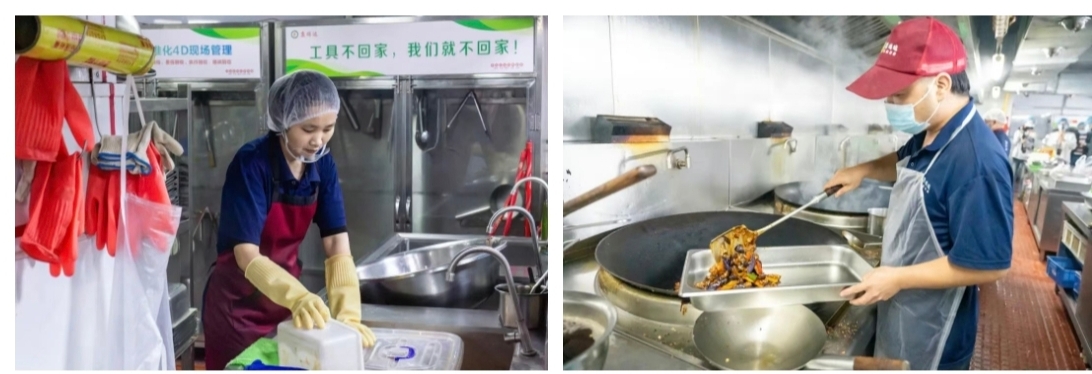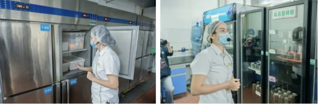 参观队伍依次经过仓储区、清洗区、切配区、烹饪区、餐具洗消间及食品留样柜等关键区域。庄经理详细介绍了食材采购查验、仓储管理、清洗加工、烹饪制作、餐具消毒、食品留样等各个环节的标准化操作流程与卫生管理规范。师生们亲眼见证了后厨整洁的环境、分类清晰的用具、规范的操作以及“互联网+明厨亮灶”智慧监管系统的实际运行。通过零距离接触,师生代表对饭堂严谨、透明的工作流程有了直观深入的了解,增进了对餐饮服务工作的理解与信任。