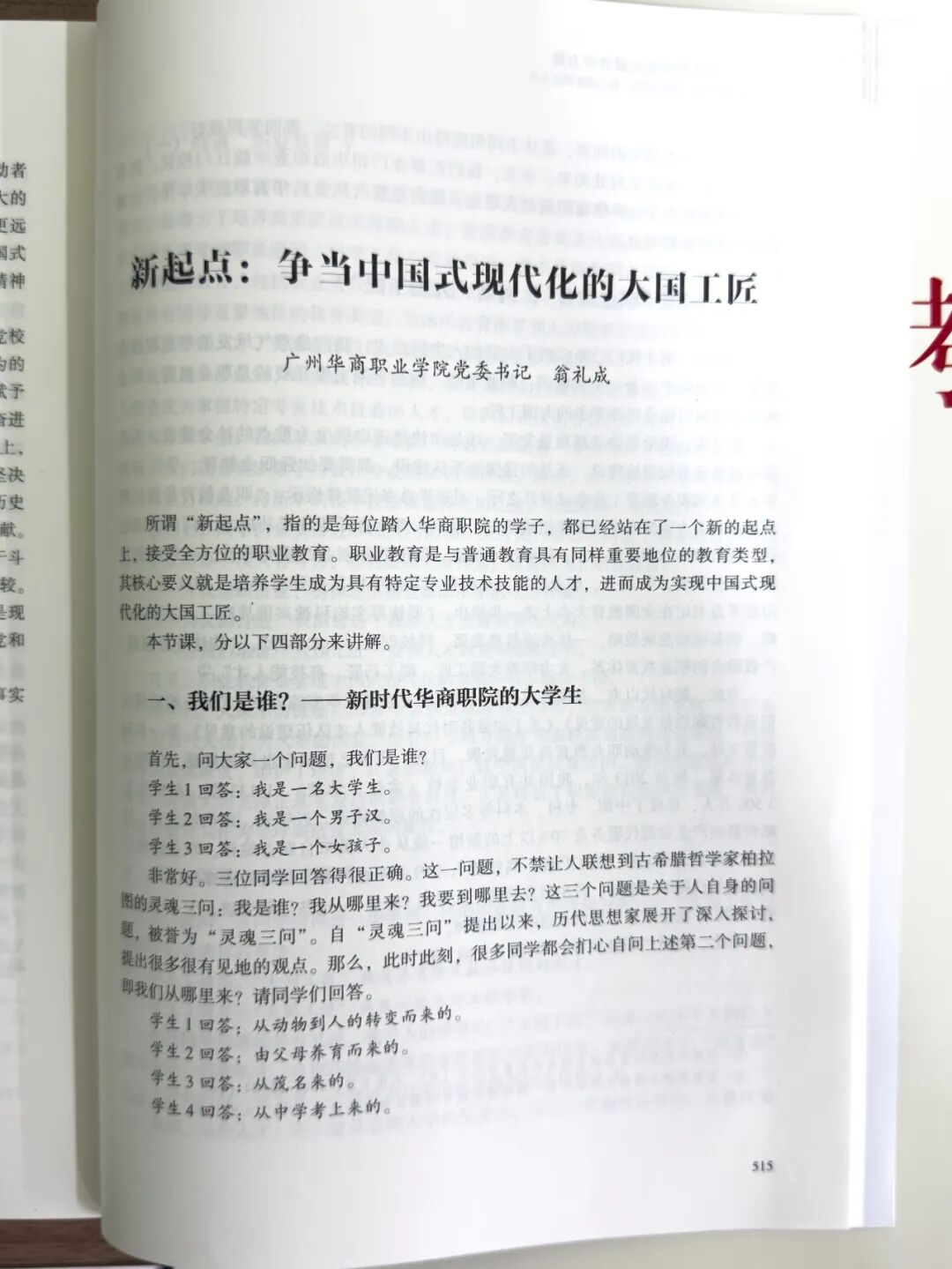 近日,广东省委教育工委、省教育厅组织编印的《广东高校党委书记、校长思政“第一课”精品文集》正式出版。广州华商职业学院党委书记翁礼成教授的思政“第一课”讲稿《新起点:争当中国式现代化的大国工匠》成功入选,充分彰显了学校思政课程建设的扎实基础和育人成效。 翁礼成书记的思政“第一课”紧扣职业教育特色和时代脉搏,以“新起点:争当中国式现代化的大国工匠”为主题,围绕“我们是谁”“何谓职业教育与大国工匠”“新时代面临的挑战与优势”以及“我们要到哪里去”四个维度展开。课程创新性地将柏拉图“灵魂三问”引入课堂,通过师生互动问答的形式,引导学生深入思考个人身份认同与时代使命。 讲稿深度融合了习近平总书记关于职业教育的重要论述,系统阐释了职业教育在中国式现代化进程中的战略地位。翁书记结合数据与会计专业实际,生动讲解了职业教育如何为制造业输送人才、如何支撑“大国智造”,并深度剖析了“执着专注、作风严谨、精益求精、敬业守信、推陈出新”的大国工匠精神内涵。 课程直面当代大学生在学习习惯、自律能力、社会竞争等方面面临的现实挑战,同时客观分析了青年学生的核心优势,提出“年轻是最大的资本,学习是最强的能力”。翁礼成书记还特别强调青年在中国式现代化进程中的责任担当,勉励学生“要珍惜韶华、把握青春、不忘初心,做有理想、敢担当、能吃苦、肯奋斗的新时代搏击者”。 此次入选省级精品文集,是对我校思想政治教育工作的高度肯定。学校将以此为契机,持续深化思政课改革创新,推动党的创新理论入脑入心,为培养更多担当民族复兴大任的时代新人贡献华商智慧和力量。 图文来源|马克思主义学院 初审|黄奕琳 复审|梁杨清 终审|程璇